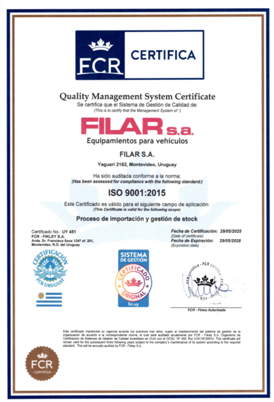 Es con mucha alegría y orgullo les informamos que el 29 de mayo de 2025, FILAR S.A, ha sido certificada por la norma ISO 9001:2015 en el Proceso de importación y Gestión de Stock.